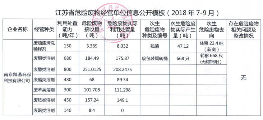 江蘇省危險廢物經(jīng)營單位信息公開模板(2018年7-9月)