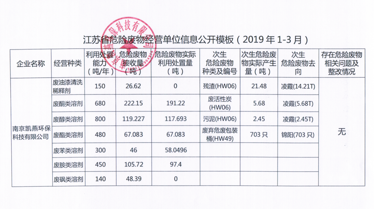 江蘇省危險廢物經(jīng)營單位信息公開模板(2019年1-3月)