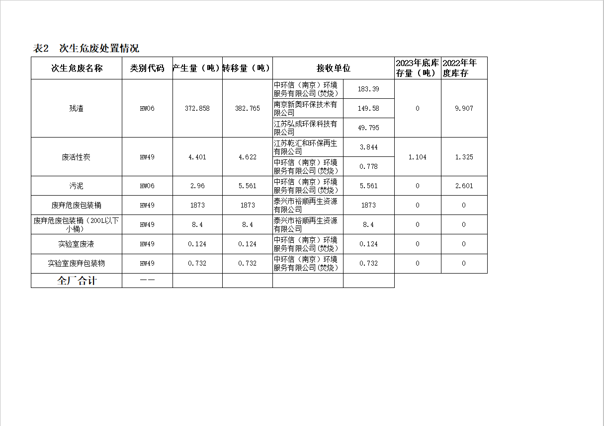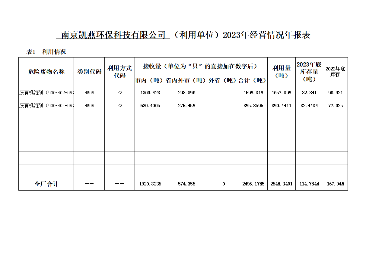 南京凱燕環(huán)??萍加邢薰?023年危險(xiǎn)廢物經(jīng)營(yíng)情況報(bào)表